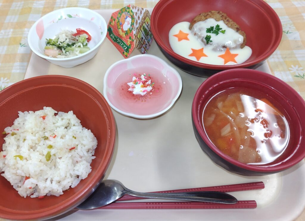 メニューはバターライス、クリスマスハンバーグ、シーフードマリネ